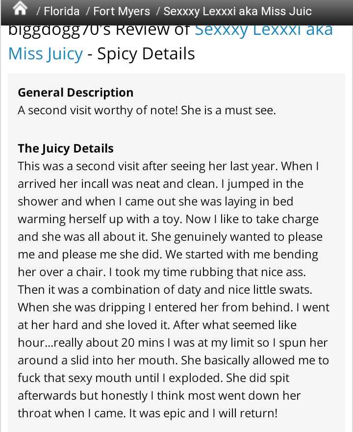 Book meHello welcome to my website, my name is Sexxxy Lexxxi also known as Miss Juicy. I take pride in providing top quality companionship and sensual massage. Each session is a stimulating climax filled with exciting rendezvous each time. Let me take you to that place you have only dreamt about. GUARANTEED to leave you with a smile.